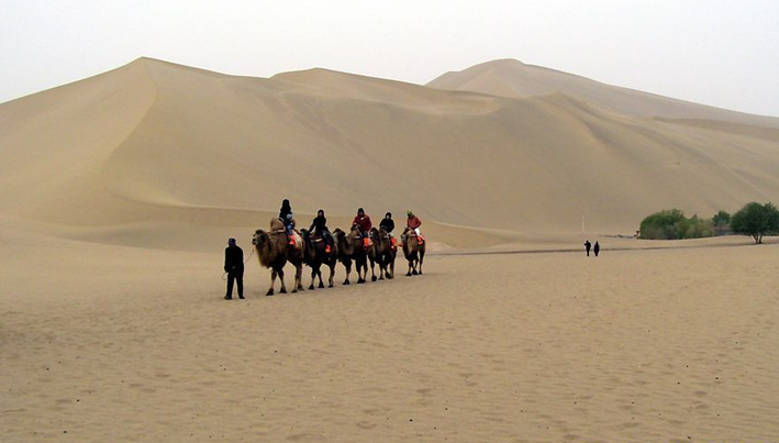 敦煌鳴沙山位于甘肅省敦煌市南五公里處巴丹吉林沙漠和塔克拉瑪干沙漠的過渡地帶。沙峰起伏,人們順坡滑落,便會發出轟鳴聲,稱為“沙嶺晴鳴”,為敦煌八景之一。