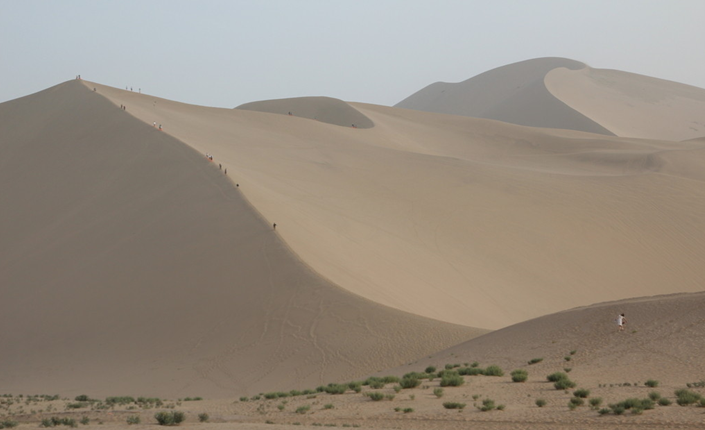 由于山勢陡峭,攀登只能緩緩而上。下山時,沙粒會隨人流動,發出管弦鼓樂般的隆隆聲響,真是扣人心弦。