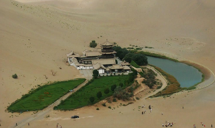 月牙泉位于敦煌市西南5公里處,是一處神奇的漫漫沙漠中的湖水奇觀。鳴沙山下,泉水形成一湖,在沙丘環抱之中,酷似一彎新月而得名月牙泉。月牙泉,古稱沙井,俗名藥泉,泉邊蘆葦叢生,水中魚兒自在,胡楊沙棗綠樹成蔭,羅布麻、枸杞等藥用植物豐茂,亭臺樓榭古香古色,春夏季節百花盛開,夏秋季節梨果飄香。自漢朝起即為“敦煌八景”之一,得名“月泉曉徹”。月牙泉南北長近100米,東西寬約25米,泉水東深西淺,最深處約5米,彎曲如新月,因而得名。一灣清泉,漣漪縈回,碧如翡翠。泉在流沙中,干旱不枯竭,風吹沙不落,蔚為奇觀。歷代文人學士對這一獨特的山泉地貌、沙漠奇觀稱贊不已。月牙泉因“泉映月而無塵”、“亙古沙不填泉,泉不涸竭”而成為奇觀。“晴空萬里蔚蘭天,美絕人寰月牙泉,銀山四面沙環抱,一池清水綠漪漣”。 月牙泉有四奇:月牙之形千古如舊、惡境之地清流成泉、沙山之中不淹于沙、古潭老魚食之不老。版權所有山東聊城聊之旅國際旅行社有限公司,轉載必究!去鳴沙山月牙泉游玩以傍晚、黃昏時分最佳。月牙泉有三寶:鐵背魚、五色沙、七星草,傳說鐵背魚和七星草一起吃可以長生不老!月牙泉南岸的小花羅布紅麻是泉邊獨特而唯一的保健中草藥,也有延緩衰老的功效,每年6,7,8月小花盛開,猶如夜幕中的點點繁星,版權所有山東聊城聊之旅國際旅行社有限公司,轉載必究!根據老輩人的說法:敦煌特有的狗魚也許就是鐵背魚,月牙泉南岸的羅布麻或許就是傳說的七星草! 月牙泉處于鳴沙山環抱之中,面積 0.88公頃,平均水深3米左右,水質甘冽,清澈如鏡。千百年來沙山環泉而不被掩埋,地處干旱沙漠而泉水不濁不涸,實數罕見。泉內星草含芒、鐵魚鼓浪,山色水光相映成趣,風光十分優美。