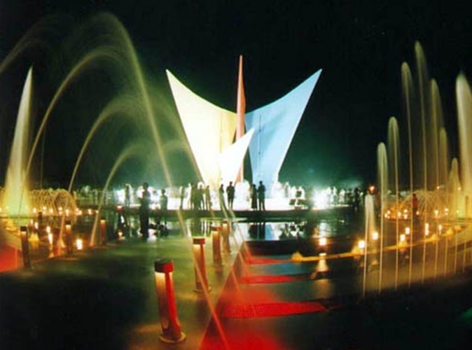 位于煙臺經濟技術開發區金沙灘海濱公園正門處,為一圓形階梯狀構筑,整個廣場噴泉灑珠,青草滴翠,花紅樹綠,烏囀鶯啼,使人仿佛置身天上的街市,神奇無比。北部最高點矗立著一組風帆群雕,在碧海藍天間顯現出勃勃生機,象征著開發區在改革開放的大潮中乘風破浪,一帆風順;入夜,這里華燈齊放,燦爛輝煌,風帆通體發光,昂揚向上,寓意著光輝的前景和時代的精神。