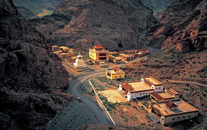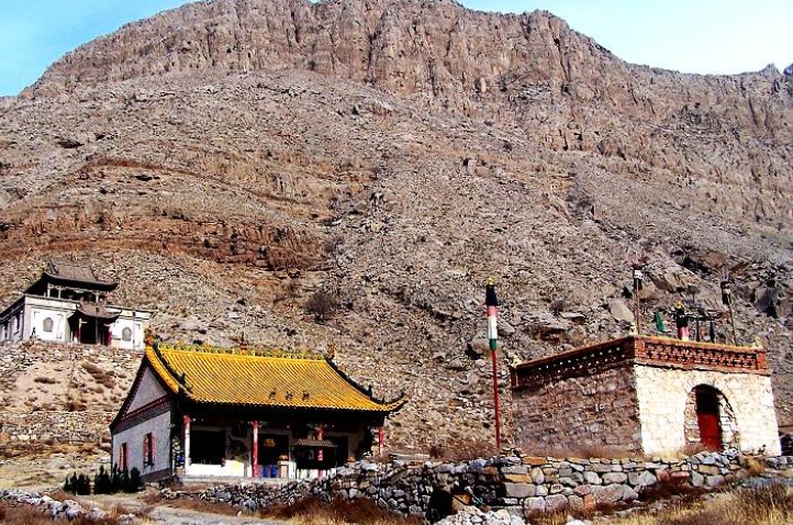 阿貴廟位于蹬口縣沙金套海蘇木境內的狼山山脈中,坐落在漢代古城雞鹿塞西邊的溝內,是內蒙古地區紅教喇嘛的唯一寺廟。蒙古語意為有山洞的廟。占地1500畝。清朝定名為“宗乘寺”。為典型藏式建筑,順山勢建成大雄寶殿及陪殿,共981間。阿貴廟奉其創始人印度僧蓮花生為祖師。