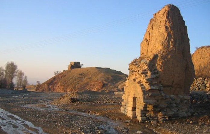 大壩灣烽燧 位于包頭市西郊哈業胡同鄉雷家圪旦村北烏拉山大壩溝溝口西側,大壩溝障城東墻北端,緊貼趙長城,呈圓錐狀隆起,底徑 20 米,頂徑 6 米。殘主,高 3.5 米。