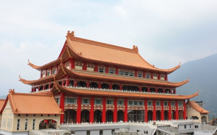靈巖山寺位于南投臺埔里鎮中正路105號,1984年由妙蓮法師創建。主要建筑有念佛堂、東西廂寮房、五觀堂、愛道講堂、東西客堂、凈宗講堂、觀音殿、華嚴殿、閱經樓、藏經閣、護法殿、山門、凈宗學佛院等。先淤1995年建成念佛堂。寺院建筑中尤以1996年建成的大雄殿為壯觀宏偉。大殿占地面積近五千平方米,殿高十多層,設有鐘樓、鼓樓、大講堂,可同時容三千人參修。大殿供奉的釋迦牟尼佛像,重達50頓,金相巍巍,供在大殿的四樓。目蓮、阿難塑像小於釋尊侍立兩側,十六羅漢立象又小於目蓮、阿難,侍立釋尊左右。