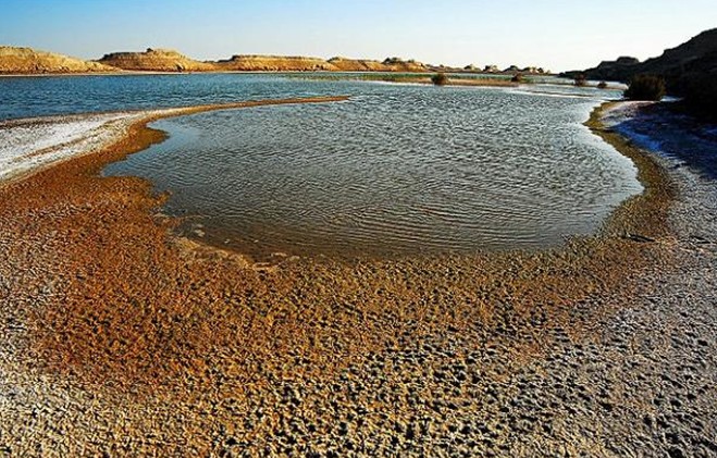 羅布泊“地下死海”主要分布在東北部的涸湖盆地底,表面是堅硬的鹽殼,當挖一個2m米深的洞穴后,就可看見“地下死海”的真面目。用棍棒觸攪穴中水后,提離水面都會結上一層白色的鹽晶體。與死海不同的是,這里的水深藏在巖石或土層縫隙中,鑿開一洞穴后,水就嘩嘩涌集一起。