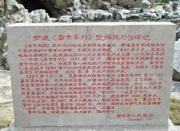 《南京條約》史料陳列館,位于南京市獅子山西麓的古靜海寺遺址上,該館通過(guò)4個(gè)展廳共130余幅(件)圖片、史料和實(shí)物,向人們展示了英帝國(guó)主義侵略中國(guó),腐敗的清政府屈膝求和、割地賠款這一中國(guó)近代史上屈辱的一幕。館內(nèi)新增的條約陳列室,陳列著我國(guó)近代(至1949年)與外國(guó)政府簽訂的1100多個(gè)條約,其中大部分是不平等條約。教育人民勿忘國(guó)恥,振興中華。