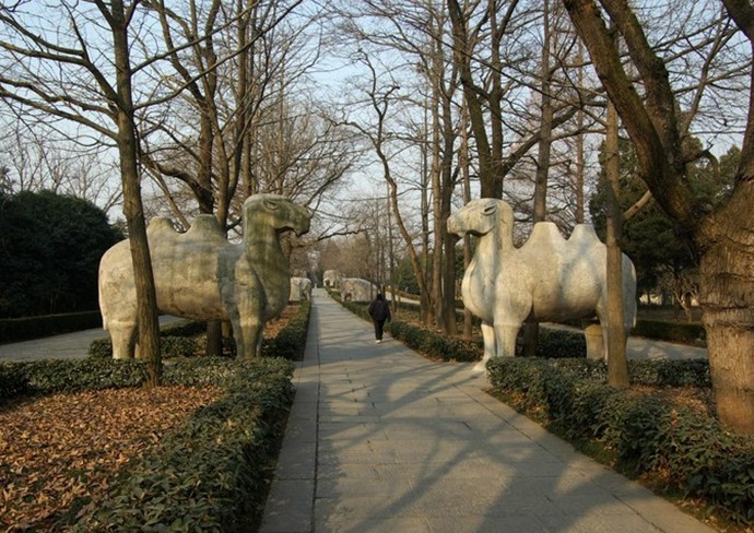 明孝陵的開創性地位還體現在其依山勢地形蜿蜒曲折的陵墓神道。陵墓的神道從四方城開始。四方城是一座碑亭,位于衛橋與中山陵之間,是明成祖朱棣永樂三年(公元1405年)為其父朱元璋建的“大明孝陵神圣功德碑”。其頂部已毀,僅存方形四壁,內有立于龜趺座上的石碑一塊,碑高8. 78米。碑文由朱棣親撰,計2746字,詳述明太祖的功德。碑座、碑額雕琢瑰麗。神道由此向西經外金水橋(今紅橋),繞過梅花山再折向北,長約1800米。其中段為石象路,這段路上相向排列著12對石獸,分別是獅、駱駝、象和馬等6種,每種兩對,姿態是一對伏,一對立。后面是一對高大的華表,上雕云龍,氣勢不凡。折向北面的神道上分別列著4對身著盔甲或蟒袍的文臣武將,有些已經損壞。石人石獸的體型都很巨大,是明代石刻的藝術珍品。南京博物院前院長梁白泉研究員說:“明孝陵首開了第一代皇帝陵寢的神道作為后世子孫陵寢共用神道的制度。神道兩邊分布的12對石像生和4對石人,石刻風格多樣,造型厚重簡樸,融整體宏大與局部精細為一體,也代表了中國明初石雕藝術的最高水平。”