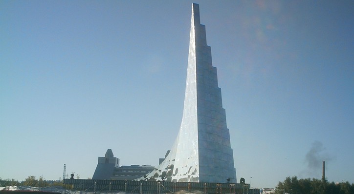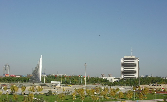 廣場內的主體雕塑命名為“騰飛”,她既像一個翅膀,又像一頁角帆,她高27米,采用鏡面不銹鋼板制成,耀眼發光,象征大慶油田蓬勃向上的氣勢,充分展示了大慶石油工人開拓進取,創造美好未來的抱負與理想。