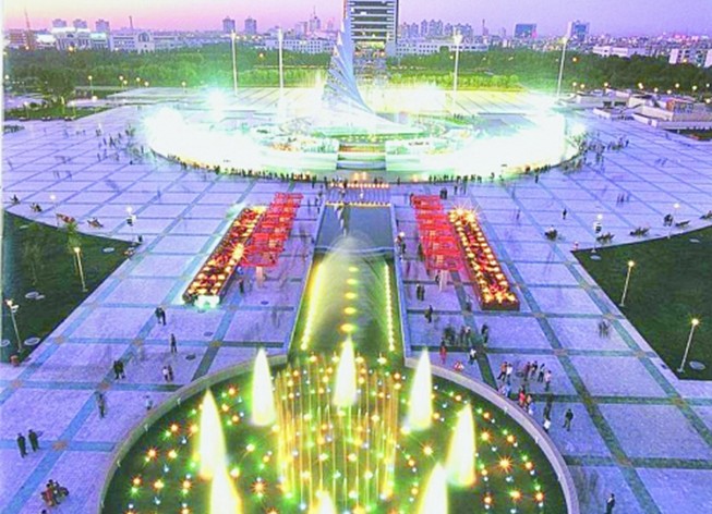 音樂噴泉是圍繞主體雕塑而設置的,分別有中心音樂噴泉,環形音樂噴泉,旱噴泉、激光水幕四部分,其中,中心音樂噴泉的4個25米高的主噴泉噴涌時,在效果燈、五彩燈和地埋燈的映照下,五彩繽紛,令人驚嘆,廣場西側的金字型建筑,就是激光水幕控制室,反映在水幕上的各種景物,都來自這個控制室的操作。