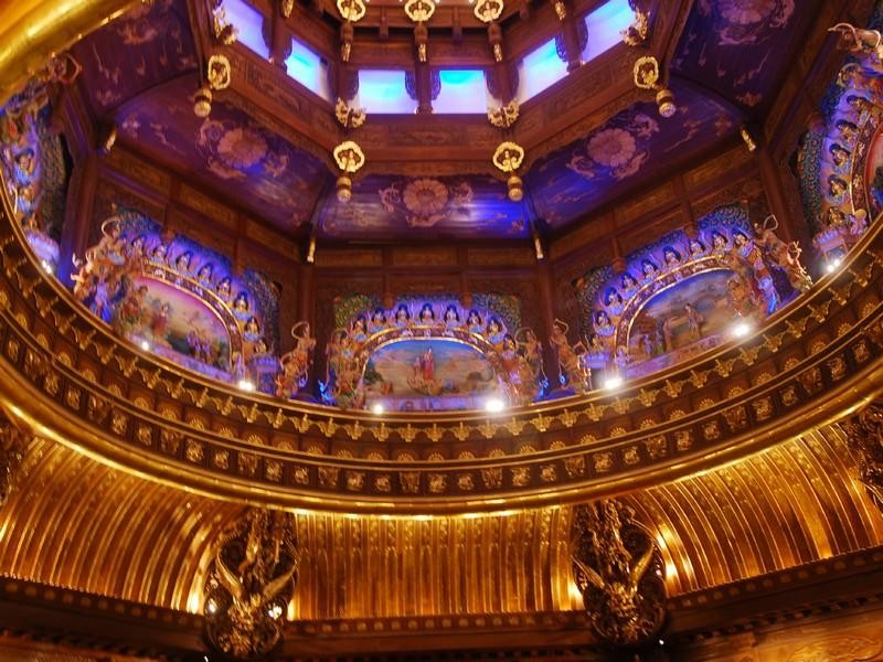梵宮內(nèi)部各建筑空間獨立且互相貫通,由門廳、廊廳、塔廳、圣壇、三傳會議廳、千人宴會廳等組成。精雕細(xì)琢的東陽木雕、敦煌技師的手工壁畫、光燦奪目的琉璃巨制、精致典雅的甌塑浮雕壁畫、技藝精湛的揚(yáng)州漆器、恢宏大氣的油畫組圖、古雅精麗的景泰藍(lán)須彌燈、精美的景德鎮(zhèn)青花斗彩缸……這些匯集眾多文化遺產(chǎn)、眾多藝術(shù)瑰寶的藝術(shù)珍品遍布靈山梵宮的各個區(qū)域,將優(yōu)秀的傳統(tǒng)文化演繹得淋漓盡致,令人目不暇接、回味無窮。