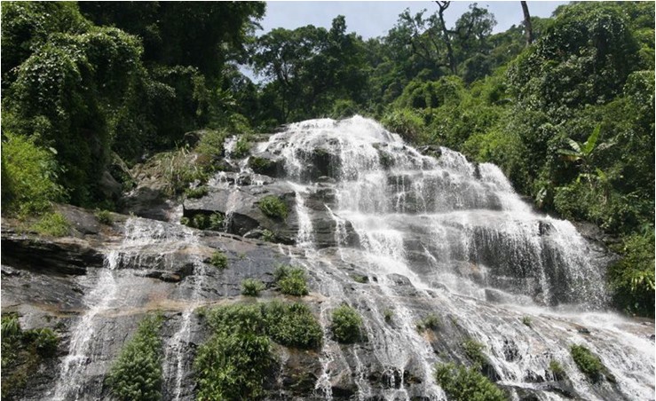 登上百花嶺觀瀑亭,便可欣賞到那直瀉的飛流,猶如飄拂的銀鏈懸掛在山間,呈三級跌宕瀉下,嘩嘩作響,周圍煙籠霧繞,景色奇特而壯觀。此瀑布因百花嶺而得名,其源頭在百花嶺的海拔700米的第二峰,含納眾匯,集水面近2平方公里。溪澗兩旁長滿茂密的原始森林,地面積被層厚,地下潛流充足,長年水流不歇,流水落差達300米,地勢跌宕,遂成三級飛瀑,而且一級一個景觀,各具特色。