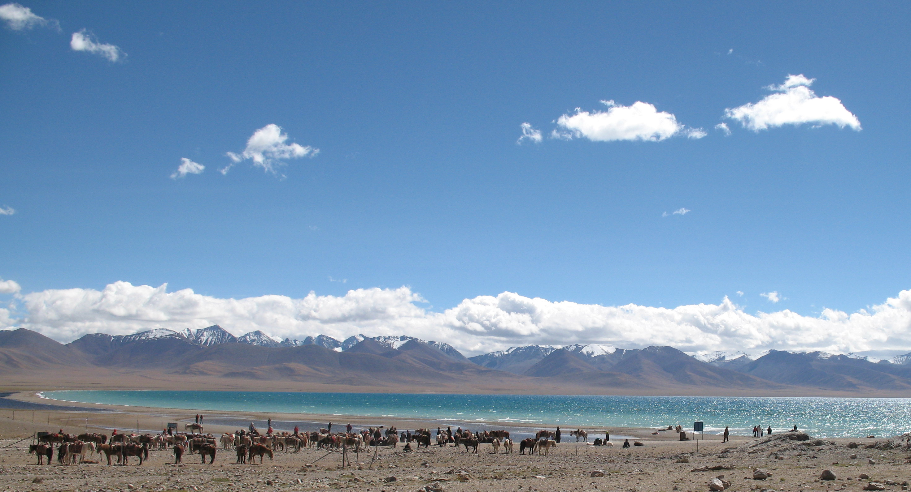 途中休息2次。10:00,在海拔4630米的念青唐古拉山觀景臺休息一會,車停在公路邊。 11:30,在那根拉山口休息。這里海拔5190米,是拉薩到納木措的最高點。但要特別注意,這里有一些當(dāng)?shù)厝藸恐笈J召M照相,非常惡劣!不給錢就擋住那根拉的石碑,不讓人照相。或者群起攻擊游客。游客在這里停留的時間有限,根本沒辦法和他們耗。最好不要和他們糾纏,能照就趕快照相。如果發(fā)生沖突,荒山野嶺,不好收拾。納木措也有一些牽馬或牦牛收費照相的。