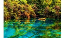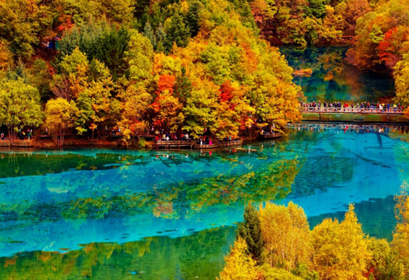 高瀑布是九寨溝最高的瀑布。站在五花海的頂部俯視其底部,那景觀妙不可言,湖水一邊是翠綠色的,一邊是湖綠色的,湖底的枯樹,由于鈣化,變成一叢叢燦爛的珊瑚,在陽光的照射下,五光十色,非常迷人。五花海有著“九寨精華”及“九寨一絕”的美名,站在五花海最高點,即老虎石上俯視,可一覽五花海全景。此處也是九寨溝最佳取景點之一。金秋時節,四周山坡上的彩葉紛紛墜落在池水中,倒影、水波、陽光、落葉的完美結合,將人間最絢爛的顏色糅合在五花海水中。 五花海是九寨溝的驕傲,從老虎嘴俯瞰,顏色好夸張,難道是有人打翻了阿拉伯神話中的藏寶箱?鋪張出一地豪華,亦或是孔雀翎織就的羽衣,拿是拿不走的,只好塞在記憶里。 犀牛海水下的色彩寧靜了許多,好像大自然進入了哲理狀態的思考,綿軟的水草只需輕輕抖動幾下腰身,就讓那藍和綠幻化出無限神秘;海拔最高的常海,已是一片冰封,壯美得肅穆。珍珠灘上的激流破冰而出,水流白中泛藍,銀中凝綠,更有大珠小珠落玉盤的韻味。夕陽照在海拔較低的蘆葦海上,搖曳出滿地金黃,仿佛在講述一個古老的故事。不時有水鳥從沼澤中撲簌簌飛起,原來,故事中的情節永遠都不會完結。