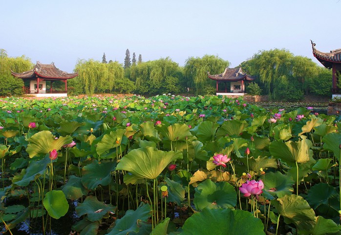無錫蠡園位于無錫市西南2.5公里蠡湖西岸的青祈村,因蠡湖而得名。相傳兩千多年前的春秋時(shí)期,越國大夫范蠡幫助越王滅吳之后,攜佳人西施于此泛舟,后人為了紀(jì)念范蠡,便以其名命名此湖。蠡湖的湖面狹無錫蠡園一隅窄,面積約有10公里,相當(dāng)于杭州西湖的1.7倍。三百多米長的寶界橋?qū)Ⅲ缓环譃槎浜耙砸荨⒁陨n涼、以浩蕩為勝,雪月煙雨各有佳景。