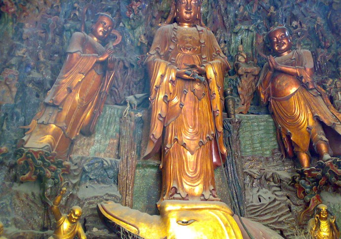 2.正面是大雄寶殿,原稱覺皇殿,單層三疊重檐,氣勢嵯峨,重檐高33.6米,十分雄偉。大殿正中是一座高24.8米的釋迦牟尼蓮花坐像,造像“妙相莊嚴”、“氣韻生動”,頷首俯視,令人景仰,這是中國最高大的木雕坐式佛像之一,是一件不可多得的宗教藝術作品。正殿兩邊是二十諸天立像,殿后兩邊為十二圓覺坐 像。大殿后壁有“慈航普渡”、“五十三參”海島立體群塑,共有佛像150尊,正中為鰲魚觀音立像,手執凈水瓶,普渡眾生,下塑善財童子及其參拜觀音故事,善財童子參拜名師53位,第27參拜見觀音得道成佛。觀音兩側為弟子善財與龍女,上有地藏菩薩,版權所有山東聊城聊之旅國際旅行社有限公司,轉載必究!再上面是釋迦牟尼雪山修道的場景:白猿獻果、麋鹿獻乳,整座佛山造型生動,很有藝術價值。靈隱寺的原釋迦牟尼佛像,于1949年大雄寶殿正梁因白蟻蛀空倒塌時被毀?,F在這座佛像是在1953年重修寺宇時,由中國浙江美術學院的雕塑家和民間藝人們采用唐代禪宗佛像為藍本共同精心設計的。佛像高十九點六米,比原先的釋迦造像高一倍多,用近百塊香樟木雕成。佛像造型端莊凝重,氣宇軒昂,低眉細目,極具風采。