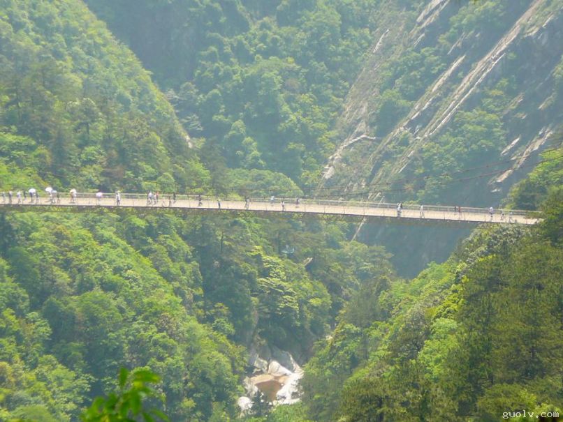 三疊泉位于五老峰下部,飛瀑流經(jīng)的峭壁有三級(jí),溪水分三疊泉飛瀉而下,落差共155米,極為壯觀,撼人魂魄。 三疊泉每疊各具特色。一疊直垂,水從20多米的巔萁背上一傾而下;二疊彎曲,直入潭中。“上級(jí)如飄雪拖練,中級(jí)如碎玉摧冰,下級(jí)如玉龍走潭。” 站在第三疊抬頭仰望,三疊泉拋珠濺玉,宛如白鷺千片,上下?tīng)?zhēng)飛;又如百副冰綃,抖騰長(zhǎng)空,萬(wàn)斛明珠,九天飛灑。如果是暮春初夏多雨季節(jié),飛瀑如發(fā)怒的玉龍,沖破青天,凌空飛下,雷聲轟鳴,令人嘆為觀之。(三疊泉門票64元/人)