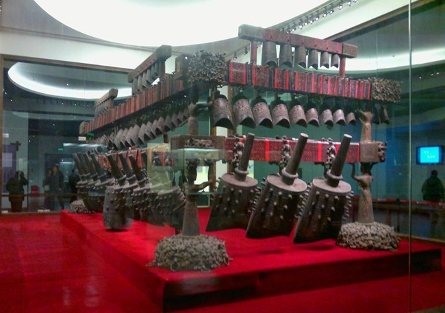 曾侯乙編鐘:時期為戰(zhàn)國時期,1978年湖北隨縣曾侯乙墓出土。鐘架長748厘米,高265厘米,重4.5噸左右。全套編鐘共六十五件,分三層,八組懸掛在呈曲尺形的銅木結(jié)構(gòu)鐘架上。每件鐘均能奏出呈三度音階的雙音,全套鐘十二個半音齊奏,可以旋宮轉(zhuǎn)調(diào)。音階為現(xiàn)今通用的C大調(diào),能演奏五聲、六聲或七聲音階樂曲。