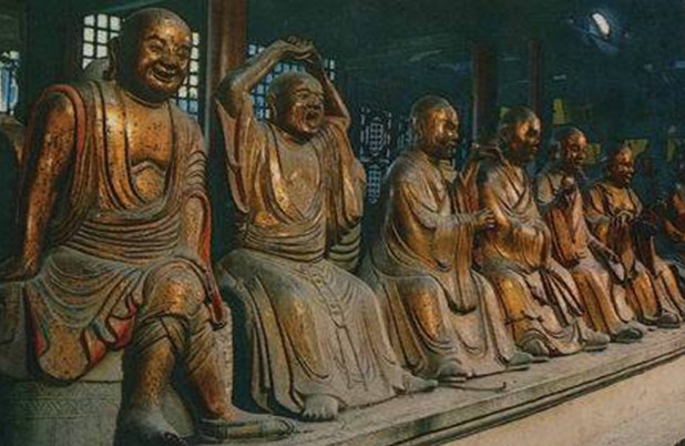 走進羅漢堂,無不被它們的生動形象所感染。只見有的盤腿端坐,有的臥石看天,有的研讀佛經,有的驅邪除惡。表情上,有的勇武,有的溫良,有的天真憨厚,有的飽經滄桑,個個維妙維肖,活靈活現。如第463尊羅漢是颯陀怒尊者,四周有6個童子,為羅漢挖耳、掩嘴、遮眼等,稱“六賊戲彌勒”。六賊即眼、耳、鼻、舌、身、意。它告誡佛門弟子,不要為凡情所染。塑像中把孩子的天真爛漫,嬌稚頑皮和羅漢的慈祥憨厚的神態刻化得淋漓盡致,讓人們從心底發出贊嘆的笑聲。