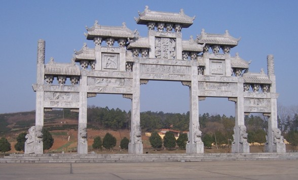 “古隆中”石牌坊高約六米,長約十米,其建造材料為青石開榫組裝而成,依外觀形式為柱不出頭有樓,四柱三牌樓式。“古隆中”牌坊寬三間,中為中間,兩旁為次間,四柱腳深埋土中,四周出土處鋪地平石,柱前后及旁,以十個紋頭砷石支撐。牌坊定盤枋斗口架正昂板,兩正昂間置花板,并雕流空花紋,以為裝飾。正昂上平鋪脊筒檐板,其檐板叉出發戧,戧角作鴿尾形。牌坊脊板兩端并飾魚龍吻,中央置火焰珠。