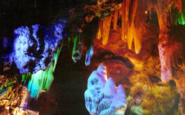 再登第二段鐵梯,便可看到洞壁上螢光點綴的葡萄狀石花,姹紫嫣紅,或成串,或散開成片,異常珍貴。與石葡萄為鄰的還有一根直徑為0.05米,高3.1米的石柱,粗細均勻,筆直挺立,被稱為“定海神針”,這也是洞內最細的石柱,屬重點保護景觀。而與石葡萄相隔3米,洞壁上覆蓋著一層枝芽狀石花,形如海中珊瑚,熠熠生輝,這些就是珊瑚石。