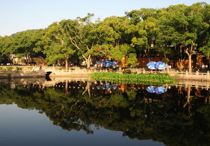 蓮花池三面環山,四周古樟參天,池水為山泉所積,清瑩如玉。每當盛夏之際,池中荷葉田田,蓮花亭亭,映襯著古樹、梵宇、拱橋、寶塔倒影,構成一幅十分美妙的圖畫。夏季月夜到此,或風靜天高,朗月映池;或清風徐徐,荷香襲人。
