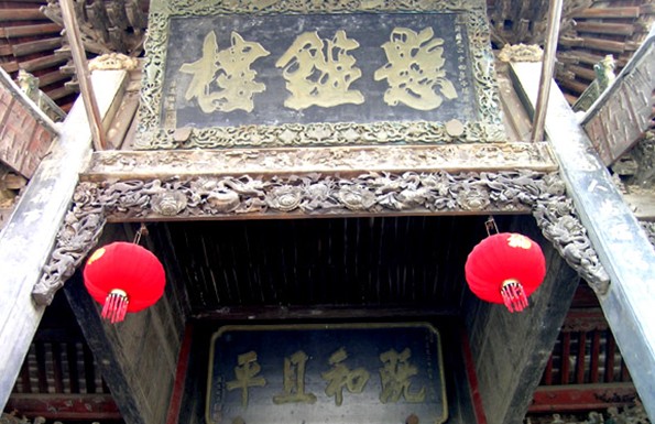 這分別是鐘樓和鼓樓,相對稱坐落于懸鎰樓兩側,鐘樓內懸大鐘一口,鐘高5尺,重2千余斤,人稱聚將鐘,亦稱“金鐘報曉”,鼓樓在西側,內懸掛更鼓一面。
