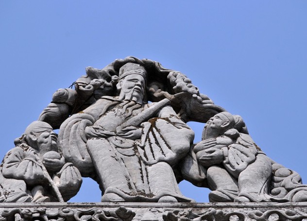 大拜殿,是會館的主體建筑,由大殿和拜殿兩部分組成,長40米,寬22米,高23.14米。殿前兩側立兩塊石室式單據歇山頂式石雕,版權所有山東聊城聊之旅國際旅行社有限公司,轉載必究!高2米,寬1米,單檐硬山頂,左側刻:“十八學士登瀛洲”。圖中有杜如晦、房玄齡、于志宇等不畏艱險,騎馬沿崎嶇小路登上為天下人慕向的瀛洲。