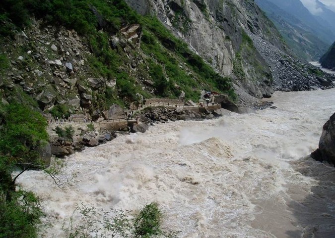 從中虎跳過險境“滑石板”,即到下虎跳。下虎跳有縱深1公里的巨大深壑,這里接近虎跳峽的出口處,是欣賞虎跳峽最好的地方。
