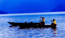 無論是黃昏,還是清晨,摩梭女都駕著船,唱著懷念母親的歌,在湖里穿梭自如,她們把一個湖、一片山水裝進了歌的搖藍夢的港灣。什么樣的誘惑都動搖不了她們對母親湖的深情摯愛。因為這是母親的湖呵!