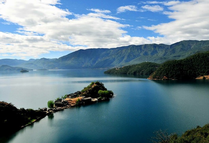 瀘沽湖不僅水清,而且島美。瀘沽湖四周青山環抱,湖岸曲折多灣,共有17個沙灘、14個海灣;湖中散布5個全島、3個半島、1個海堤連島,一般高出水面15至30公尺,遠看象一只只綠色的船,飄浮在湖面。其中,寧蒗一側的黑瓦吾島、里無比島和里格島,成為湖中最具觀賞和游覽價值的三個景點,被譽為“瀘沽三島”。黑瓦吾島位于湖心,距離湖岸落水村2500米,島上樹術蔥籠,百鳥群集,是南來北往的候鳥、野鴨的棲息之處,也是昔日永寧土司阿云山總管的水上行宮,美國學者洛克也曾旅居于此。