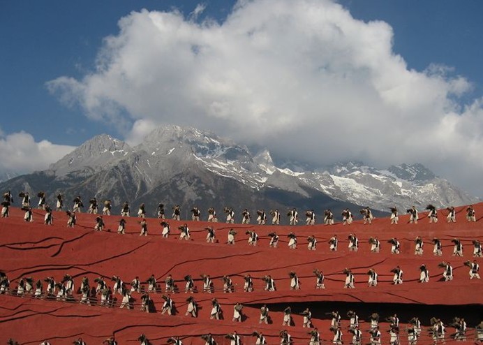 來自10個少數民族的鏗鏘漢子,來自16個鄉下村莊的普通農民,500多個有著黝黑皮膚的非專業演員,用他們原生的動作,用他們質樸的歌聲,用他們滾燙的汗水,與天地共舞,與自然同聲,帶給你心靈的震撼。《印象•雪山》大型實景演出克服了白天演出的諸多弊端,在經過近百次的修改之后,終于將白天的劣勢轉為優勢,讓每一個身臨其境的觀者都能真實地感受到一種從未體驗過的情感。演出全長1個小時,啟用了先進的造水工程和煙霧效果工程,與自然交相輝映,營造出令人贊嘆的視覺效果。