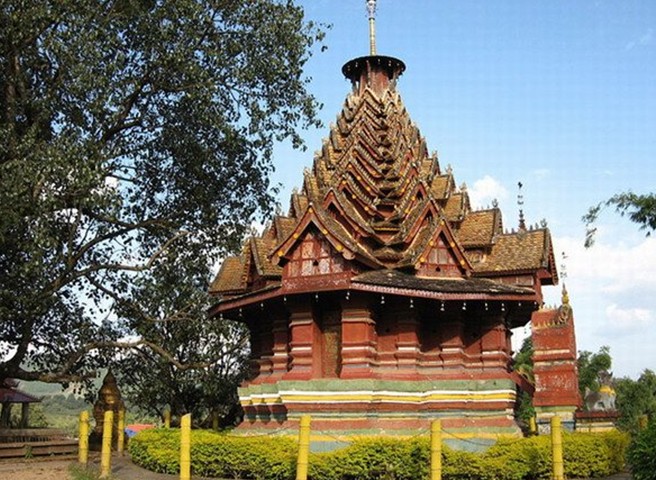 西雙版納景真八角亭位于景洪以西14公里,地處勐海縣景真山上,亭子因山而得名,是西雙版納的重要文物之一,建于公元1701年。西雙版納景真八角亭為磚木結構,呈八角形,亭身有31個斜面,鑲嵌彩色玻璃,并用金銀粉印出各種花卉、動物、人物圖案,在陽光的照射下,光彩奪目。