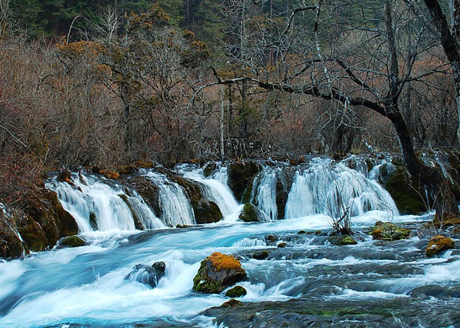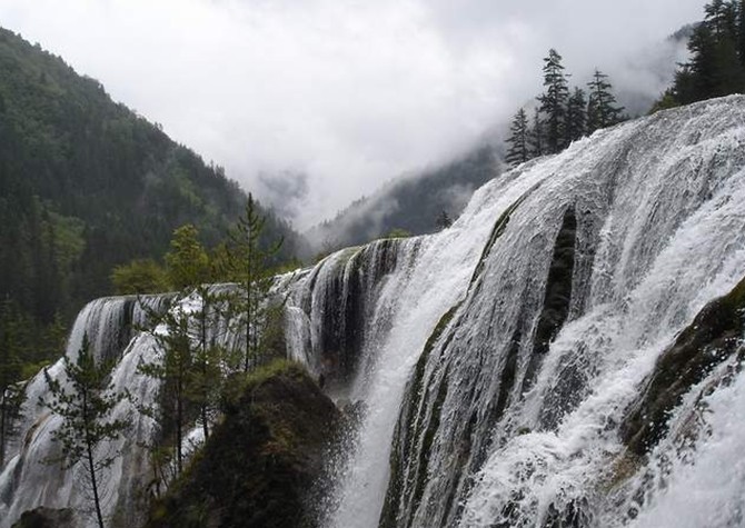 縱攬我國瀑布,或從斷崖驀然跌下,勢若大海倒瀉,銀河決口,聲勢恢宏;或從峭壁凌空飛落,狀如白綾脫軸、裊裊娜娜,姿態千般;或從洞上翻崖直下,形若水晶珠簾,垂掛洞前,妙趣橫生。而九寨溝瀑布群,則從長滿樹木的懸崖或灘上悄悄流出,瀑布往往被分成無數股細小的水流,或輕盈緩慢,或急流直瀉,千姿百態,妙不可言,加上四周群山疊翠,滿目青蔥,至金秋時節,層林盡染,瀑布之景就更為神奇秀麗了。
