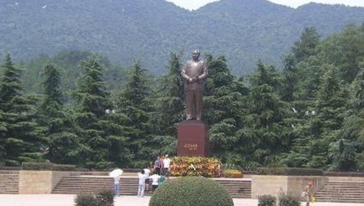 毛主席的銅像矗立在韶山?jīng)_廣場。這里背襯韶峰,是韶山?jīng)_的中心,對面就是毛氏宗祠和毛澤東紀(jì)念館。