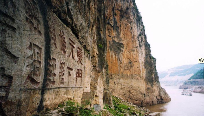 自軍地坪往百丈峽內(nèi)前行200米,右側(cè)一峰從溪畔了然聳立,高約百米,橫看如旗,側(cè)望似劍,人稱插旗峰。據(jù)傳為向王義軍豎立軍旗處。峰頂兩棵青松勁立,綠冠罩壁、溪水沿峰腳淙淙流淌而過。 百丈峽中2公里處右側(cè)有巨崖如削,凌空約300 米。距崖基10米高的石壁上,刻有“百丈峽”三個(gè)雙鉤大字,每字直徑約1米,落款為“明進(jìn)士于越大門山人李〓書”。其左刻明萬(wàn)歷年分守上荊南道兼九永兵備右參政胡桂芳詠百丈峽詩(shī)云:“峽高百丈洞云深,要識(shí)桃源此處尋。戎旅徐行風(fēng)雪緊,誰(shuí)將興盡類山陰。”另有明德石刻,記載督工鑿?fù)ㄊ诒愕兰熬璜I(xiàn)銀兩的戶主姓名等文字。插旗峰對(duì)面石壁刻有畫家黃永玉20世紀(jì)80年代題寫的“百丈峽”三字。