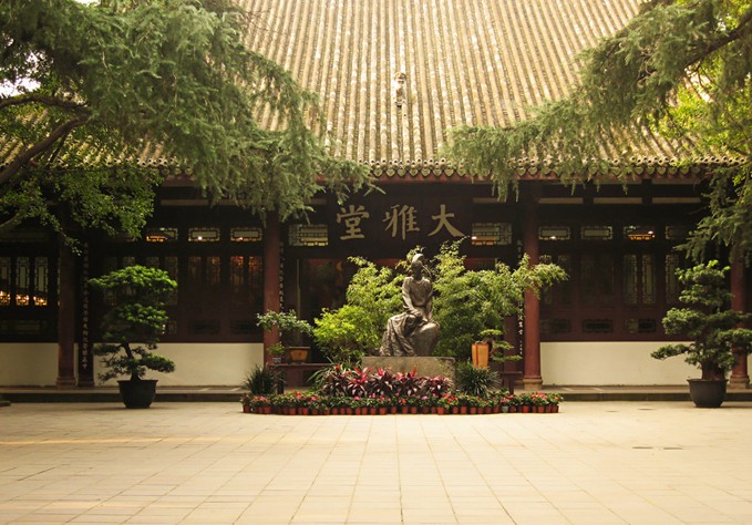 今日草堂,古樸典雅,規(guī)模宏偉,占地300多畝。其中大廨、詩史堂、工部祠3座主要紀念性建筑物,坐落在中軸線上,幽深寧靜。廨堂之間,回廊環(huán)繞,別有情趣。祠前東穿花徑,西憑水檻,祠后點綴亭、臺、池、榭,又是一番風光。園內有蔽日遮天的香楠林、傲霜迎春的梅苑、清香四溢的蘭園、茂密如云的翠竹蒼松。整座祠宇即有詩情,又富畫意,是人文景觀和自然景觀相結合的著名園林。