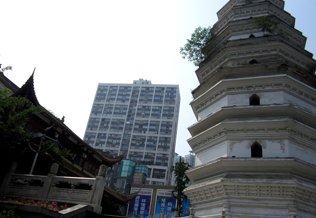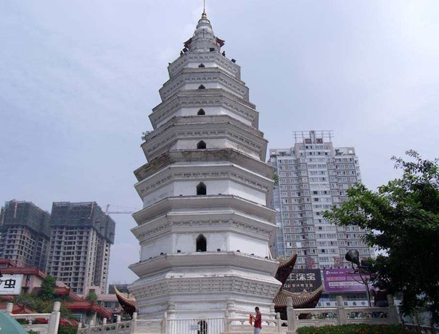 報恩塔,俗稱“白塔”,四川省文物保護(hù)單位,位于瀘州城區(qū)。建于南宋紹興十八年(1148),明弘治年間、清光緒四年、1985年三次維修。塔坐西向東,磚石結(jié)構(gòu),雙檐七級樓閣式,通高33.2米。塔身呈八邊形,層層上收,107級踏道經(jīng)塔心盤旋至頂,塔內(nèi)90龕256尊深浮雕石刻造像,人物線條流暢,栩栩如生。塔基為八邊形,邊長4.1米。
