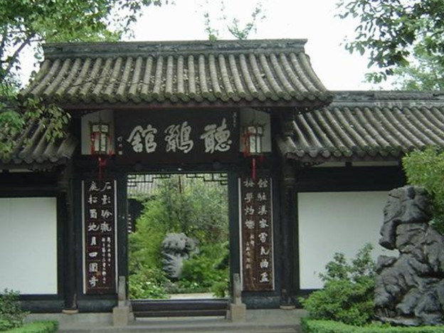 如今的草堂是在明代所建工部草堂遺址上,于八十年代重建的仿古園林建筑群。草堂內詩圣生平館,中院宏偉的詩史堂,花木扶疏的后院。暖融融的春陽下,幾樹海棠開得正艷,火焰般的花朵給清靜的小院平添了幾分亮色。碧綠的荷池中佇立著一尊杜甫的全身塑像,詩人撫袖昂首,滿含憂患的雙眼遙望著遠方。這情景使你想起那令人不堪回首的一幕:公元770年冬的一天,杜甫在離開四川后,終因病痛纏身,窮困潦倒而客死于湘江上的一艘小船上。"青春作伴好還鄉"對于詩人來說,只是一個無法實現的夢……