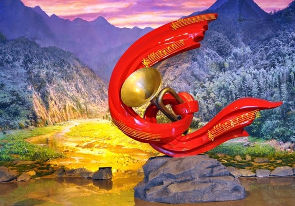 走進(jìn)新館,映入眼簾的是一個面積600平米,高9米的展覽序廳,最引人注目的是氣勢如虹的主題背景。據(jù)悉,背景油畫由清華美院師生集體創(chuàng)作,面積為600平方米,為我國目前最大的油畫。序廳是一個由巨幅油畫、主題圓雕和實體山景組合而成的大型多媒體景觀,主題鮮明,氣勢恢弘。