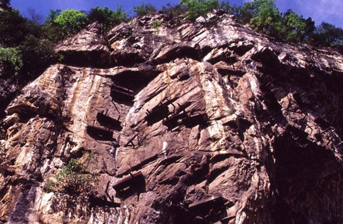 “僰人懸棺”位于四川省宜賓市境內,珙縣、興文、筠連等縣境內均有分布。我國古代的南方民族中,百越、干越、僚人、僰人(都掌人)民族都有懸棺葬的習俗。而最有名的就是川南的僰人懸棺和福建的船形懸棺。《珙縣志》載“珙本僰地,僰人多懸棺”。早在1956年就列為省級重點文物保護單位,現為全國重點文物保護單位。僰人懸棺被稱為世界之最、巴蜀一絕。