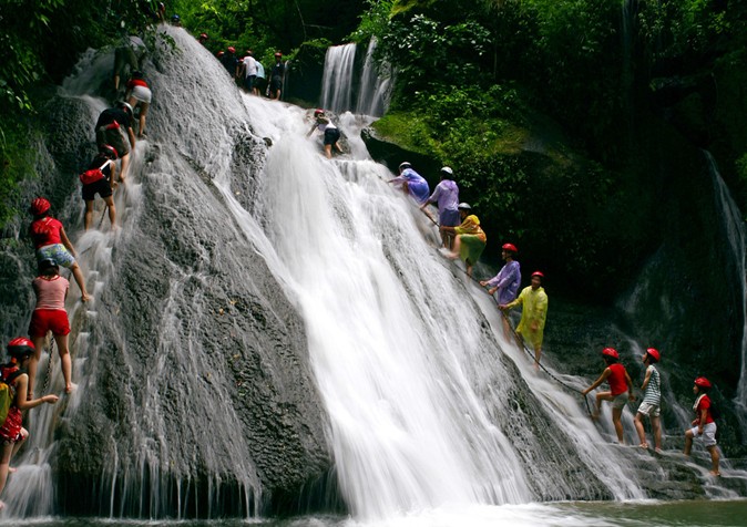 登瀑布是勇敢的活動雖然沒有大的危險,但是要游客出體力,跟在別人往往是水濺一身,下水急攀登較難,雙腳輪流向上攀登,后面有人催游客,越是想往上爬,越是走不起來,手抓鐵鏈在空中搖擺著;偶爾后邊的人會幫上面的人扶一下腳,共同協作攀登困難者,也是團結協作的團隊精神;沿小溪而上,水有深有淺,第二道瀑布明顯比第一道要小得多,故快速而過,
