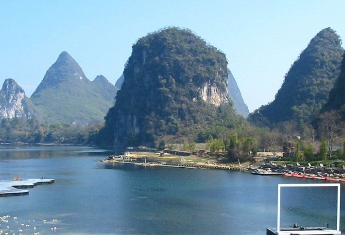 蓮峰下一貨運碼頭,叫“富安碼頭”,曾是航運業務繁忙之地,碼頭沒有臺階,上下自然形成坡度。這里便是電影《劉三姐》“對歌”的經典場景,昔時河汊里置一豪華木船實景,莫老爺和陶、李、羅三個秀才立于船頭與劉三姐“對歌”,被三姐及眾人痛快淋漓一頓臭罵,莫老爺氣急敗壞而落水一戲,便在此拍成。