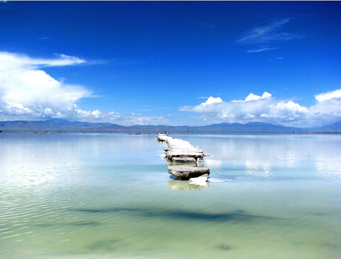 茶卡鹽湖與其它鹽湖不同的是,茶卡鹽湖是固液并存的鹵水湖,鑲嵌在雪山草地間而非戈壁沙漠上。鹽湖水域寬廣,銀波粼粼。天空白云悠悠,遠處蒼山崢嶸,藍天白云、雪山映入湖中,如詩如畫。四周牧草如茵,羊群似珍珠灑落。漫步湖上,猶如進入鹽的世界。