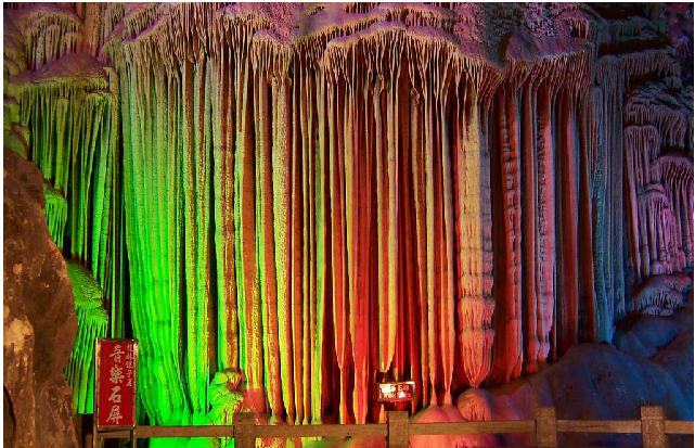 在桂林市西北7千米處的光明山上,因洞口長有蘆荻草,其可制牧笛而命名。蘆笛巖是一個地下溶洞,深230米,長約500米,最短處約90米,其游程雖比七星巖短,但景色卻比七星巖更奇。蘆笛巖內(nèi)鐘乳石,石筍、石柱、石幔,石花玲瓏多姿,景象萬千,由此所組成的雄偉“宮殿”、高峻“山峰”、擎天“玉柱”、無邊“林海”無不雄奇瑰麗,耀眼奪目,因此蘆笛巖享有“天然藝術(shù)宮”之美稱,與七星巖并列為“桂林兩大奇洞”。蘆笛洞內(nèi)景點有獅嶺朝霞、石乳羅帳、青松翠柏、盤龍寶塔、云臺攬勝、簾外云山、原始森林、琉璃宮燈、遠望山城、幽景留聽等。