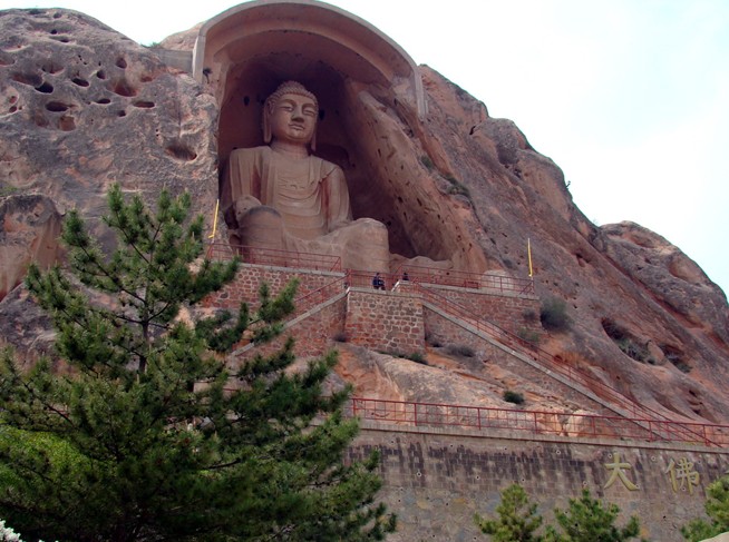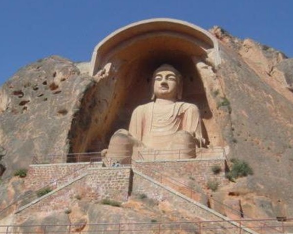 最為引人注目的,是須彌山入口處高達(dá)20.6米的彌勒大座佛。它高坐于唐代大中三年(849年)開鑿的一個(gè)馬蹄形石窟內(nèi),身披袈裟,頭流螺髻;臉如滿月,雙耳垂肩,神情莊重,十分壯觀。這座大佛比云崗石窟中最大的十九窟坐佛和龍門石窟的奉先寺盧舍那佛還高,是全國最大的造像之一。走近觀察,只見那佛高大魁梧,足有五六層樓高,耳朵有兩人高,眼窩直徑1米多,佛雖大,但雕刻卻十分的精致。專家說,這完全是一塊完整的罕見巨石雕琢出來的,充分顯示了中國古代工匠的高超技藝和雄偉氣魄。唐代統(tǒng)治者提倡佛教,武則天曾下令全國各州建大佛寺,造大佛像。有學(xué)者推測,這等大佛可能是在武則天掀起的崇拜佛的浪潮中建造的。站在大佛的腳下,眼前似有云霧繚繞,耳旁隱聽山泉叮咚,山石霧松組成大西北黃土高原上獨(dú)特的山水畫卷