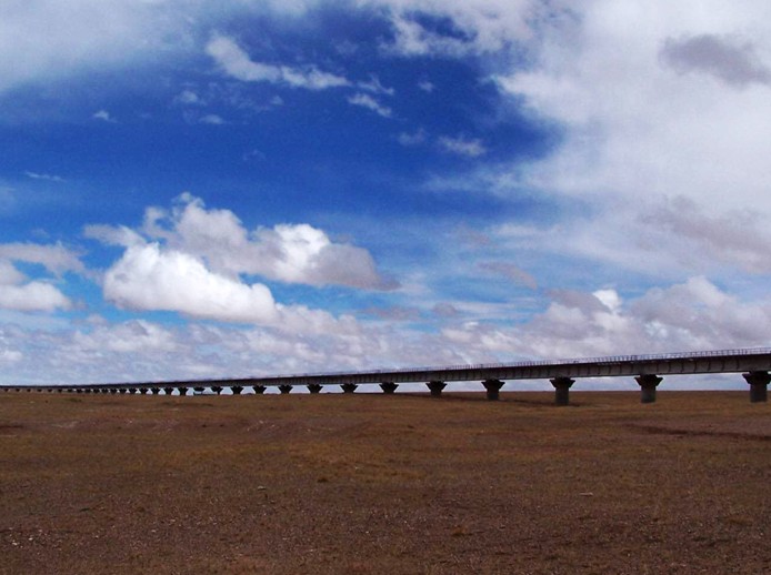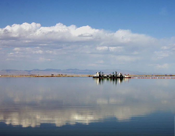 萬丈鹽橋道寬路長,風光無限。人們乘車來到這里,只見筆直坦蕩的路橋,象一把利劍將浩瀚的鹽湖一劈兩半。鹽橋兩旁有鉀肥廠的廠房,宿舍,有溝壑一般的采礦點,不遠處還有舉世聞名的青藏鐵路,一列列長蛇似的火車,吞云吐霧,鳴鳴吼叫著從湖面上飛馳而過。