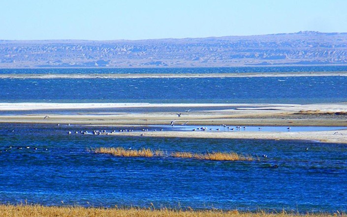 可魯克湖和托素湖雖然相距很近,而且有著相同的生態環境和變遷歷史,然而它們的姿態、風貌和性格卻迥然不同。可魯克湖屬于微咸性淡水湖,湖床低洼不平。巴音河的水常年帶著大量的牛羊糞和其他有機物注入湖內,使湖底變得泥質肥厚,雜草叢生,尤其是浮游生物極其豐富,而這些都是魚類天然的飼料。所以湖中土種湟魚和條鰍屬魚類很多??婶斂撕宄海嫫届o,景色綺麗旖旎。托素湖則是典型的內陸咸水湖,水生動植物和浮游動植物很少,湖的周圍全是茫茫的戈壁灘。托素湖湖面遼闊,湖岸開闊,無遮無攔,晴天時,湖面煙波浩淼,水天一色,蔚為壯觀;大風刮起,則浪濤洶涌,浪花飛濺,拍岸有聲,動人心魄。