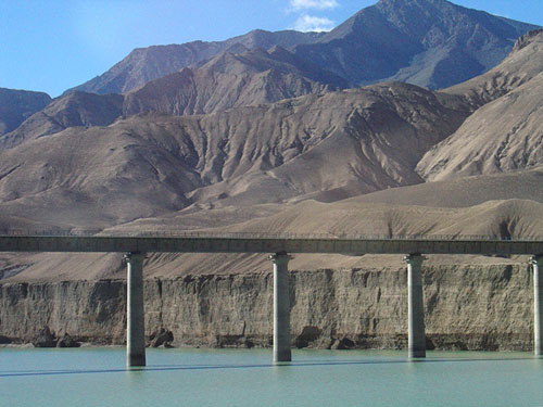 格爾木河上氣勢雄偉的格爾木水電站被稱為昆侖山下的明珠。格爾木河是柴達(dá)木盆地南緣的一條大河,昆侖山峰攝的冰雪夏日消融,它挾帶著營水奔騰咆哮。它的背后是一個(gè)碧波閃閃的人造水庫,庫容為四百多萬立方米;它的前面是一條飛架嶙峋峽谷兩岸的凌空鐵索天橋,水庫的水從大壩的三扇泄洪閘門噴涌而出,猶如霰雪,又似瀑布,玉珠四濺,水霧飛騰。