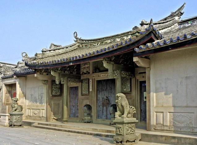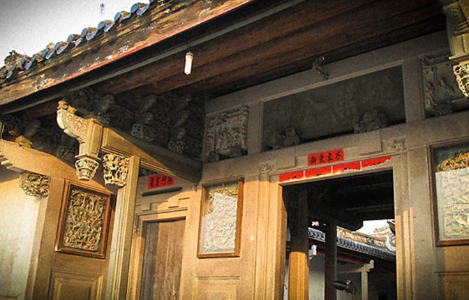 琳瑯滿目的建筑裝飾,使整座建筑物顯得更加富麗堂皇,首進(jìn)門樓前理分置精致石獅一對,門樓屋架為雙面鏤空石雕。而最令人嘆為觀止的還是鑲嵌于門樓石壁上的四幅石雕.這四幅石雕分別以土農(nóng)工商,漁樵耕讀,花鳥蟲魚為題材,每幅石刻都很好地運(yùn)用了“之”字形的構(gòu)圖,將不同時空的人、事、物集中在同一畫面,濃縮故事情有節(jié)。表現(xiàn)最富戲劇性的瞬間。