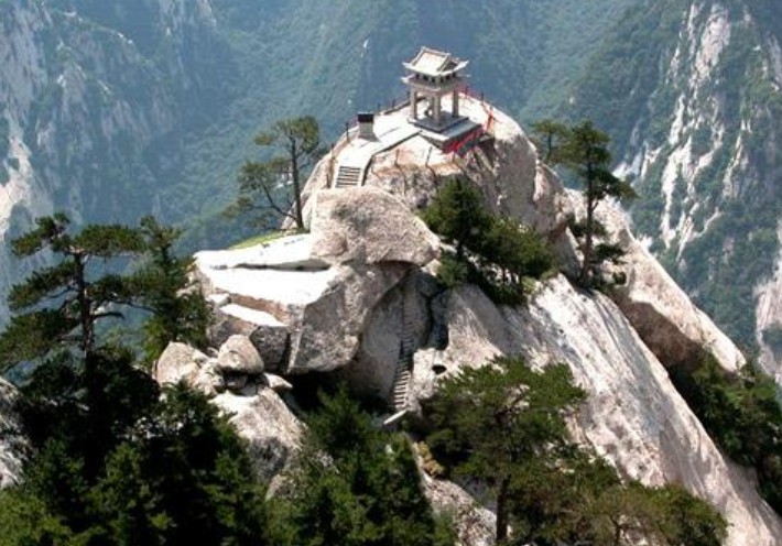 10、從玉泉院出發,經“回心石”、“千尺幢”、"百尺峽"和“老君犁溝”到北峰,從北峰南上,經“擦耳崖”、“蒼龍嶺”,過金鎖關,從這里可分別前往東、中、南、西三峰。
