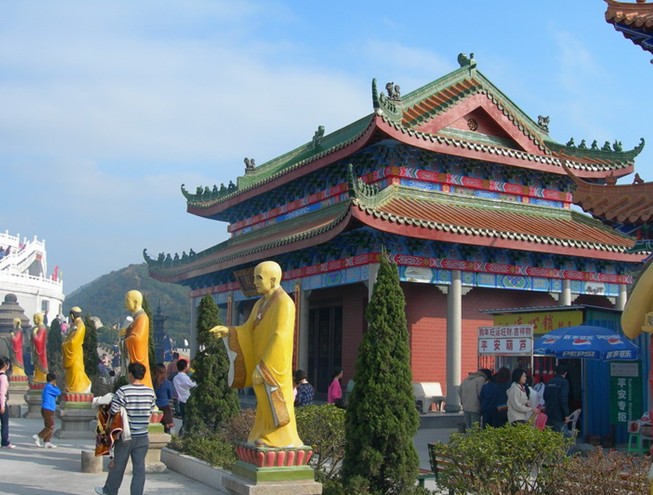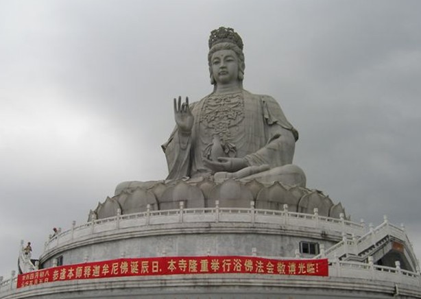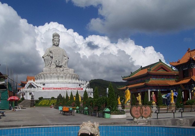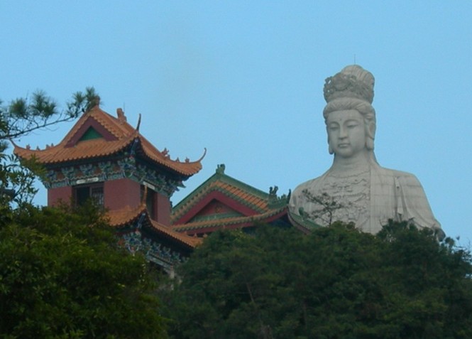 觀音廣場位于488米的觀音山頂,占地面積10000平方米,視野開闊,花繁葉茂,空氣清新,四季宜人。觀音菩薩圣像,就是目前全國乃至全世界最大的花崗巖觀音菩薩雕像。這尊觀音菩薩的圣像主題高33米,橫截面寬10.2米,體積有630立方米,總重3300噸,是由999塊0.5至8噸不等的福建蒲田優質花崗巖拼裝而成。圣像由國家一級雕塑師陳寶如設計,全部采用人工雕鑿,從1997年9月動工,至2001年6月竣工,歷時四年,總工日達98600個。